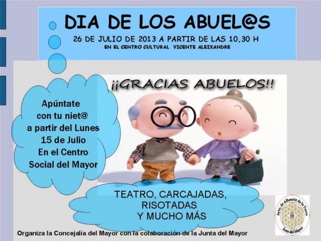 El Área del Mayor del Ayuntamiento de Alhaurín de la Torre ha abierto el plazo de solicitudes para participar en la celebración del Día de los Abuel@s, que como es tradicional tendrá lugar el día 26 de julio, coincidiendo con la onomástica de San Joaquín y Santa Ana. En esta ocasión, se ha optado por enfocar la cita en torno al teatro, para que los abuelos y sus nietos pasen una agradable jornada presenciando un espectáculo escénico en el Centro Cultural ‘Vicente Aleixandre’.