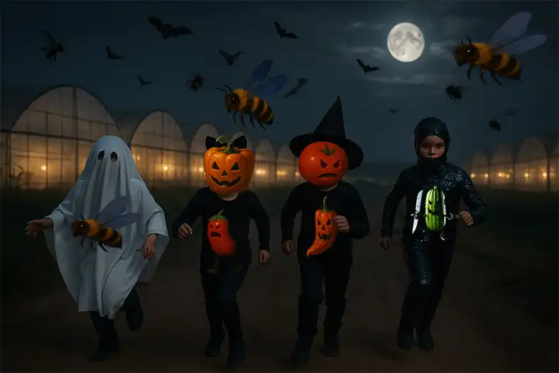 Los murciélagos los dejaría, pero como aliados para comerse a los thrips, que nos darían mucho más juego que las monótonas arañitas y telarañas de los americanos, y por supuesto metería abejorros gigantes, que zumbasen toda la noche, picoteando cabecitas de flor en flor. Ya me imagino a los niños disfrazados de verduras zombis, corriendo despavoridos para no ser picoteados por los virus que a su vez huyen de los abejorros, arañas y murciélagos.