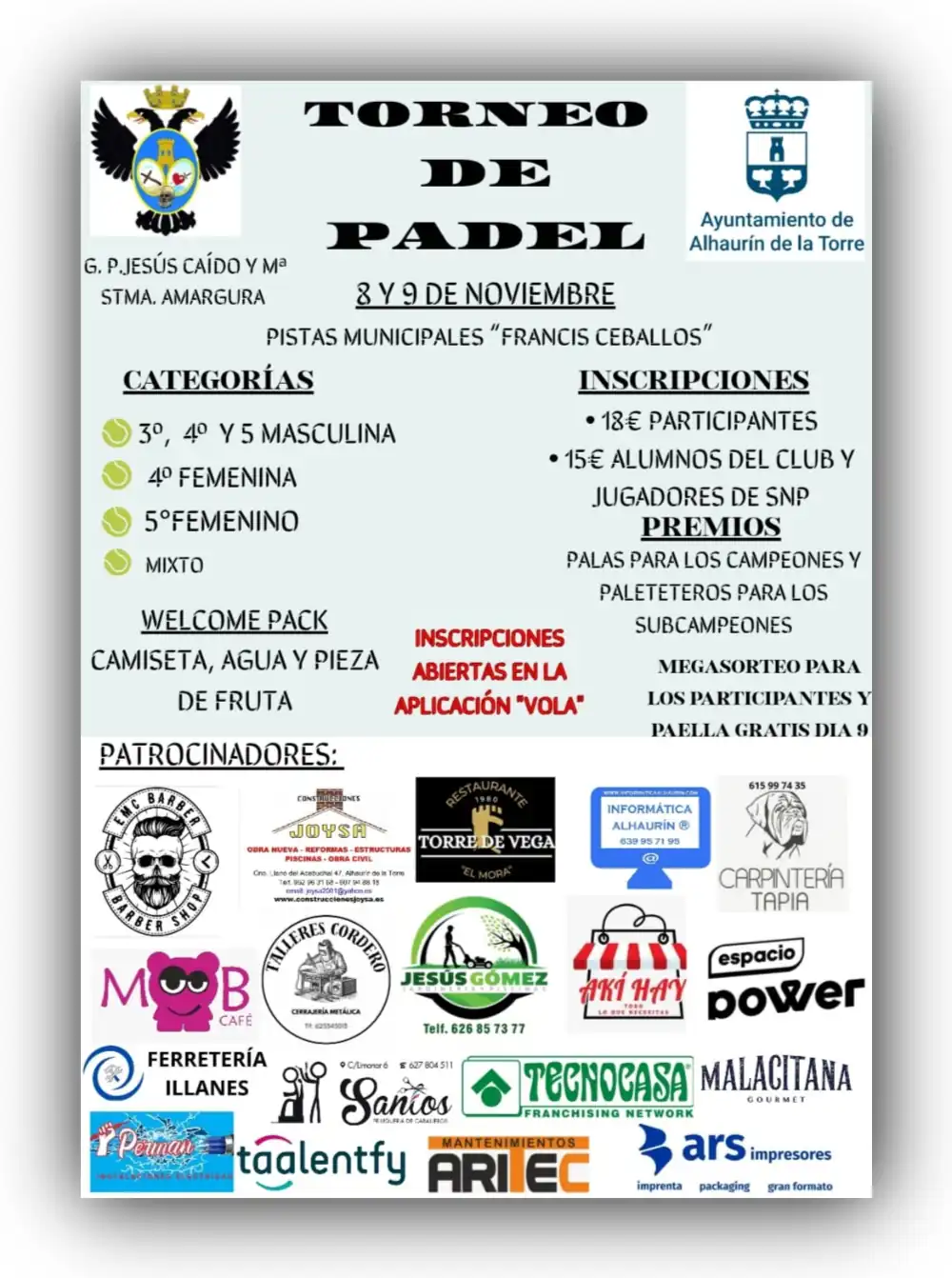 Las Pistas Municipales Francis Ceballos serán el escenario los días 8 y 9 de noviembre del Torneo de Pádel del Grupo Parroquial Jesús Caído y María Santísima de la Amargura, una cita deportiva que promete reunir a numerosos jugadores y aficionados locales en un ambiente de compañerismo, deporte y convivencia.