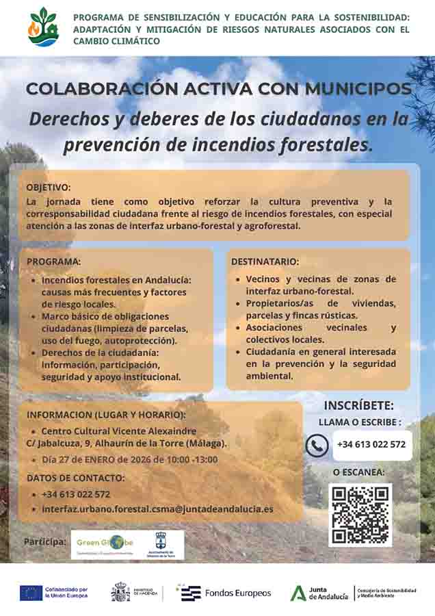 El objetivo de estas actuaciones promovidas por la Junta de Andalucía y exigidas por la Unión Europea es “sensibilizar a la población y al tejido local en la prevención de incendios”, promoviendo una “cultura de corresponsabilidad” entre ciudadanía y administraciones.