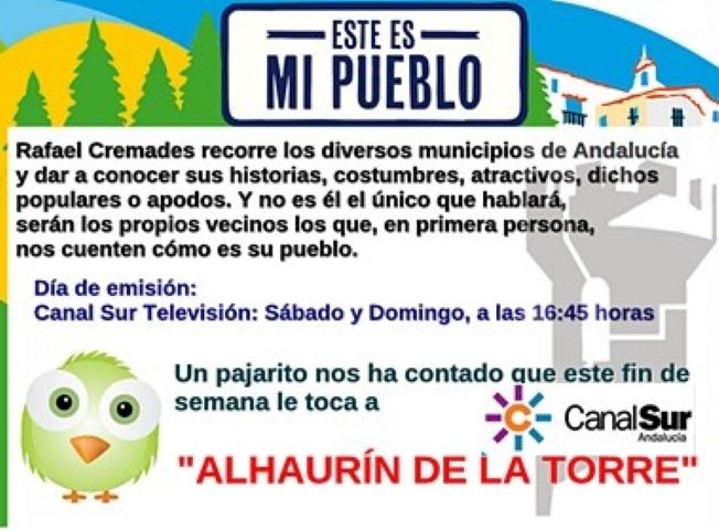 Este domingo, en horario de 16:45 en la Televisión Pública andaluza, Canal Sur, el programa de Rafael Cremades estará en el nuestro, en Alhaurín de la Torre, donde los protagonistas seremos nosotros, los vecinos, quienes serán entrevistados y contaran la historia de nuestra localidad desde el conocimiento popular.