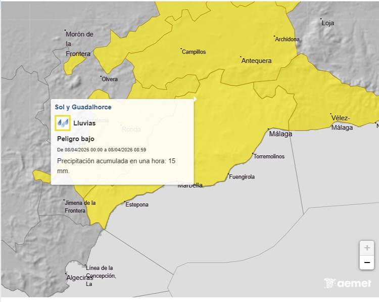 La Agencia Estatal de Meteorología ha activado un aviso de nivel amarillo por lluvias y tormentas en la provincia de Málaga para la madrugada de este martes, 8 de abril, según ha informado el servicio de emergencias 112 Andalucía.