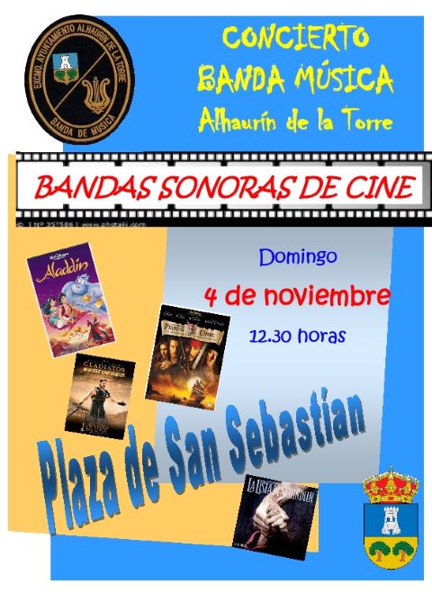 (Oficina de Prensa Ayto. Alhaurín de la Torre)La plaza de San Sebastián de Alhaurín de la Torre albergará este próximo domingo, 4 de noviembre, un original concierto de bandas sonoras a partir de las 12,30 horas. La actuación, organizada por la Concejalía de Cultura del Ayuntamiento, correrá a cargo de la Banda Municipal de Música y retoma el espíritu del ciclo ‘De Plaza en Plaza’, celebrado este pasado verano para incentivar el consumo en los establecimientos de hostelería del centro urbano. Para ello, la actividad se ha programado en torno al mediodía, con el objetivo de intentar llegar a un público de todas las edades y animar el centro. Se interpretarán conocidas piezas de películas de todos los géneros.