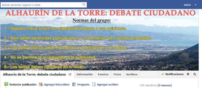 Y lamentablemente hemos tenido estos dias un ejemplo de lo que será el autentico «campo de batalla» de aquí a las próximas municipales. Ya les he hablado del grupo de debate ciudadano de Facebook, que creó mi amigo Javier Almansa hace un par de años, allí nos damos cita un par de cientos de alhaurinos casi a diario, para debatir y compartir la actualidad de nuestra ciudad. No faltan las polémicas, como no podía ser de otra forma, y aunque ha habido casos en los que algún que otro participante traspasó los limites del respeto, nada comparable con lo ocurrido las ultimas dos semanas con el «desembarco» en el grupo del Partido Popular y sus voceros. Las normas consensuadas hasta entonces, que hacían de esa «Plaza» virtual un lugar donde se comparte y analiza desde una propuesta para el nombre de una calle hasta el diseño del cartel de la feria, por poner algunos ejemplos, fueron transgredidas por los peperos virtuales, pese a las advertencias del resto, y desde el perfil oficial del partido alhaurino, se colapsó por momentos la participación, al acaparar las entradas con notas de prensa ( de la actividad municipal, por cierto, no de partido), que ademas no ofrecía ningún debate ni contestación.
