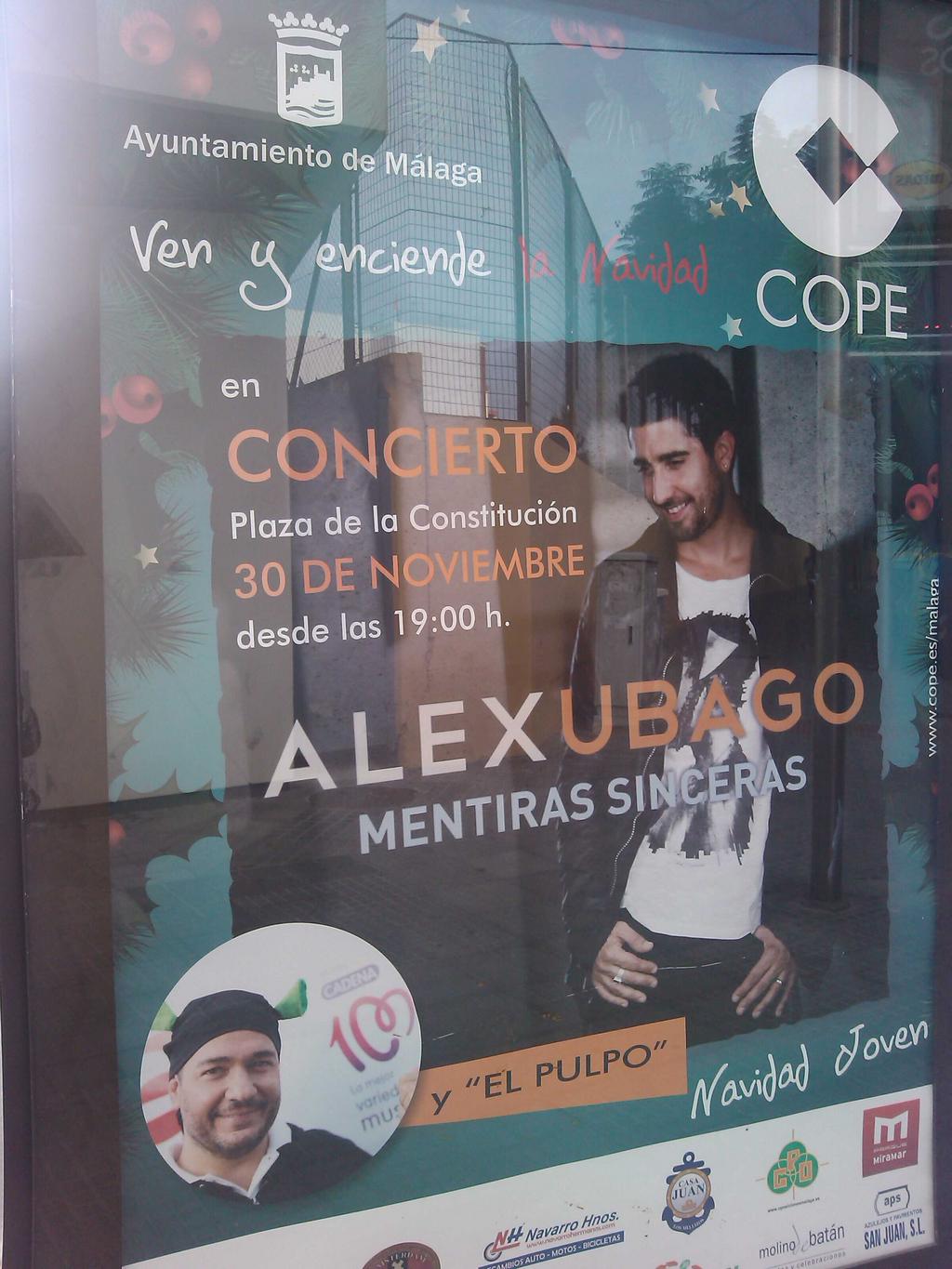 Y con el lema » Ven y enciende» El ayuntamiento de Málaga y la Cadena Cope, nos ofrece el concierto de nada más y nada menos que del cantante Álex Ubago, que nos trae su nuevo disco, Mentiras sinceras, un álbum que ha grabado en Milán y que se publica el próximo 4 de diciembre. Su creación ha coincido con el nacimiento de su primer hijo, Pablo: «Fue casualidad y un poco duro porque nació cuando estaba terminando de grabar y tuve que estar yendo y viniendo a Milán con la rabia y la pena de separarme de él siendo tan chiquitito», ha confesado el cantante, que considera este trabajo como «continuista» porque hay baladas pero también «con sonidos diferentes y con más ritmo en algunos casos».