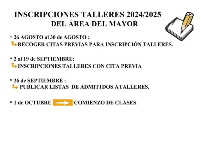 El lunes 2 de septiembre se inició el periodo de inscripciones para los diversos talleres organizados por el Área del Mayor. Es fundamental recordar que la inscripción se realiza únicamente con cita previa, la cual debió ser reservada en días anteriores. Este plazo de inscripción permanecerá disponible hasta el jueves 19 de septiembre, inclusive.