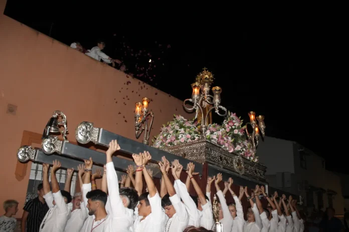 El desfile ha contado con una nutrida representación de personas ataviadas de marengas, portando los enseres con los que cuenta la asociación, así como monaguillos y, por supuesto, el trono portado por numerosos hombres y mujeres que han llenado los varales. Dicho trono ha lucido bellísimo con todos los claveles blancos que el lunes recibió la imagen durante la ofrenda.