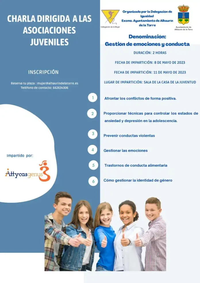 La dirigida a las asociaciones juveniles del municipio serán dos en realidad: el 8 y 11 de mayo en la Casa de la Juventud. Algunos de los temas en los que se profundizará son: Afrontar los conflictos de forma positiva, proporcionar técnicas para controlar los estados de ansiedad y depresión en la adolescencia, prevenir conductas violentas, gestionar las emociones, trastornos de conducta alimentaria o cómo gestionar la identidad de género.