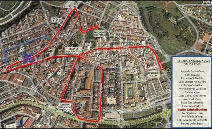 El gran desfile partió pasadas las cinco de la tarde desde la Avenida del Barrio Viejo (junto al Centro de salud) para continuar por Daoíz y Velarde, Málaga, Plaza de San Sebastián, Vicente Aleixandre, Avenida San Sebastián, Avenida Cristóbal Colón, Álamos, Gálvez Ginachero, Avenida España, Plaza San Sebastián, Juan Carlos I, Granada, Avenida de la Constitución, Sevilla, Real, Avenida Isaac Peral, Avenida de la Vega y Mirador de Bellavista hasta el Parque Municipal.