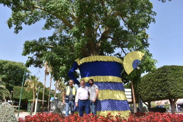 Los Servicios Operativos han preparado una espectacular decoración no sólo en el Parque Ferial, sino en otras plazas, monumentos y rincones emblemáticos. Hay que citar en concreto la rotonda del árbol de la chorisia, que se ha “vestido” con un traje de flamenca con abanico y pendientes gigantes incluidos. También se han colocado dos grandes pendientes en la histórica torre de la calle Álamos, que luce también peineta, otro abanico y una gran flor amarilla.
