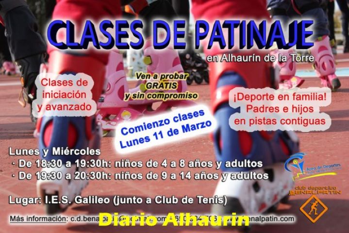 La Concejalía de Deportes del Ayuntamiento de Alhaurín de la Torre, que dirige Prudencio J. Ruiz, ha ampliado la oferta del área con la incorporación de clases de patinaje en línea, que ya han comenzado, gracias a un acuerdo con el club Benalpatín. Se trata de una escuela que hasta ahora funcionaba en Benalmádena y que ha empezado a prestar servicio también en nuestro municipio, concretamente en las pistas del instituto Galileo, con actividades para todas las edades y aptas para compartir en familia.