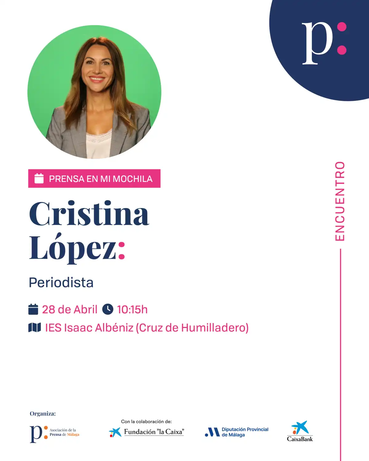 La periodista de Canal Sur Cristina López mantendrá mañana, martes 28 de abril, un encuentro con el alumnado del IES Isaac Albéniz, en el distrito Cruz de Humilladero, en el marco del programa de alfabetización mediática Prensa en mi mochila, impulsado por la Asociación de la Prensa de Málaga con la colaboración de la Fundación ”la Caixa”, la Diputación de Málaga y CaixaBank.