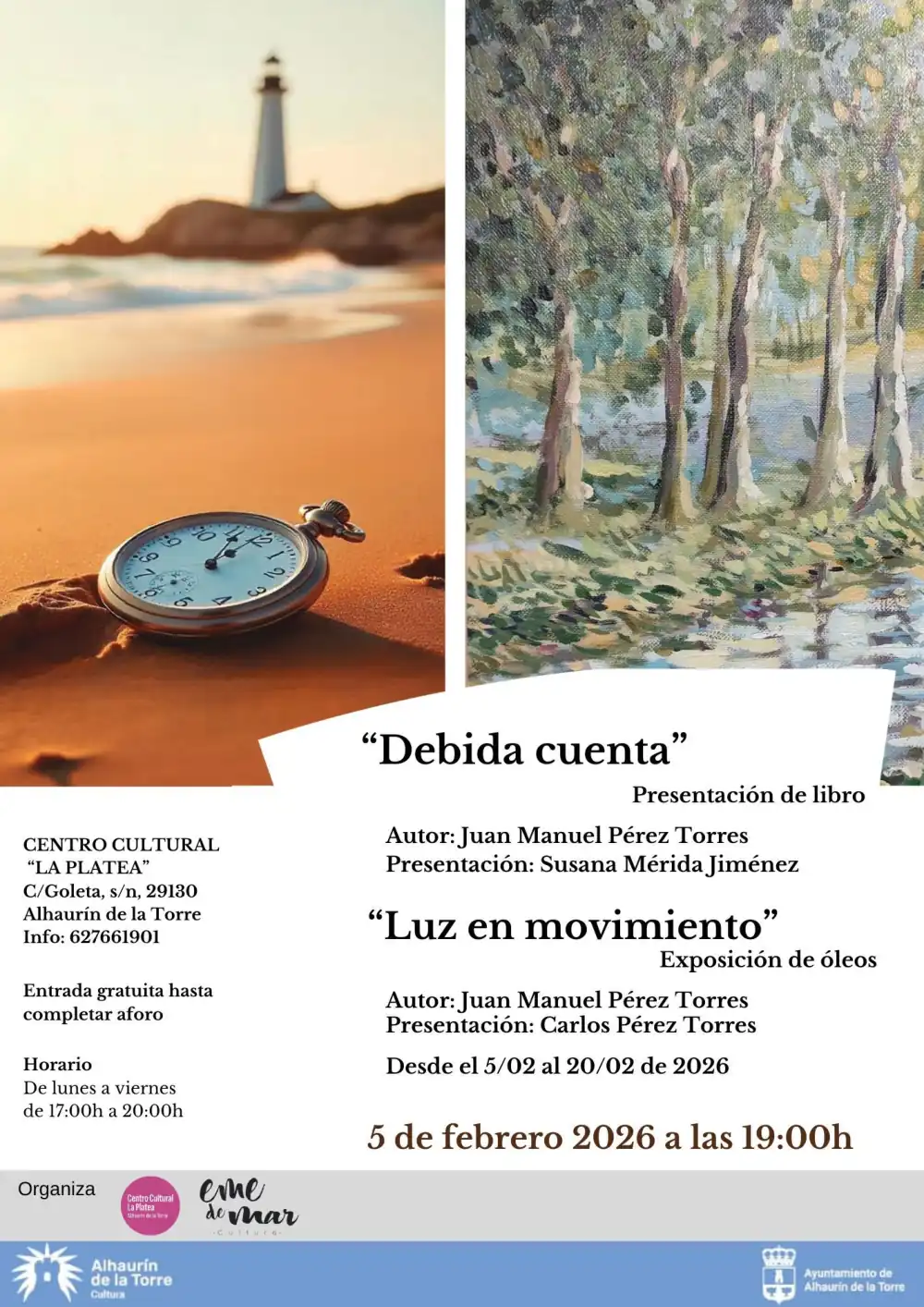 A las 19.00 horas está prevista la presentación del libro ‘Debida cuenta’, de Juan Manuel Pérez Torres, autor y artista que también inaugura su exposición de óleos ‘Luz en movimiento’, que podrá visitarse en este mismo espacio hasta el día 20