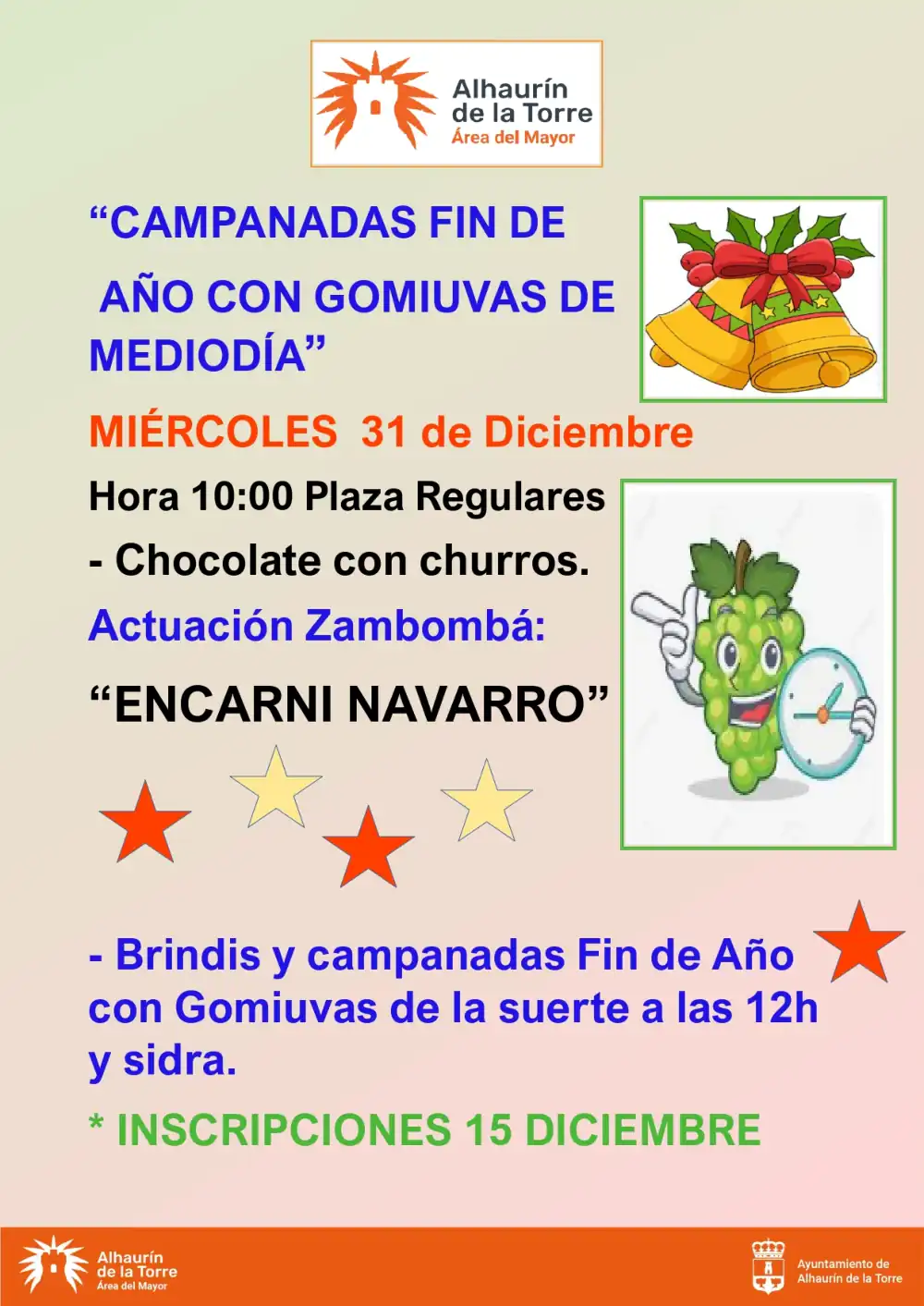 La plaza de los Regulares, un año más, volverá a ser escenario este próximo miércoles, 31 de diciembre, de un encuentro festivo dirigido a los mayores de Alhaurín de la Torre. A partir de las 10:00 horas, la plaza se llenará de ambiente navideño con el adelanto de la Nochevieja que incluirá chocolate con churros y una tradicional zambomba a cargo de Encarni Navarro.