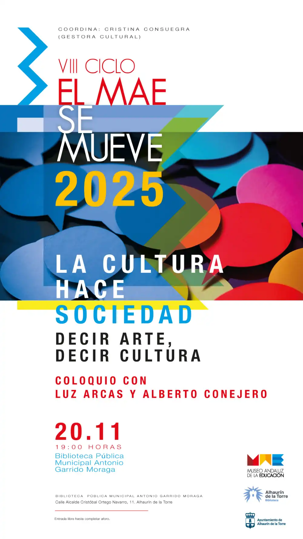 El próximo jueves, 20 de noviembre, a las 19 horas, la Biblioteca Pública ‘Antonio Garrido Moraga’ será el escenario de una nueva sesión del ciclo sobre pensamiento contemporáneo, ‘El MAE se mueve’, organizado por el Museo Andaluz de la Educación del Ayuntamiento de Alhaurín de la Torre, que alcanza, este año, su octava edición. Esta sesión se centra en las obras de dos de los mejores creadores nacionales, de singular personalidad, Alberto Conejero y Luz Arcas, cuya conversación permitirá analizar el sentido del arte, de la creación, dentro de la cultura en un momento de especial fragilidad como el actual. Ambos creadores han sido reconocidos por premios nacionales, Conejero, el premio Nacional de Literatura Dramática 2019 y, Arcas, con el premio Nacional de Danza 2024. La coordinadora del ciclo, Cristina Consuegra, será la encargada de conversar con ambos sobre los distintos asuntos que conformarán esta sesión. La entrada es libre hasta completar el aforo.