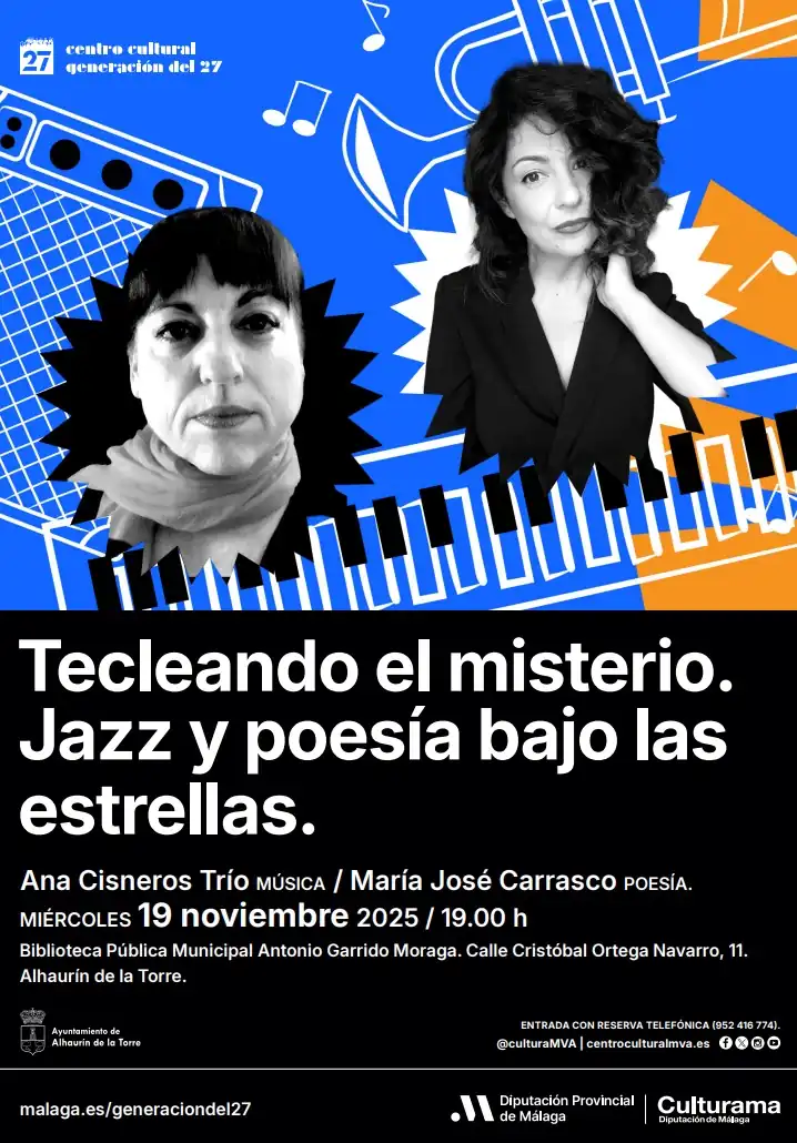 El Ciclo ‘Tecleando el misterio: Jazz y Poesía bajo las estrellas’ cuenta con una nueva cita en este mes de noviembre en la Biblioteca Pública Municipal ‘Antonio Garrido Moraga’. El ciclo, organizado por el Centro Cultural de la Generación del 27 de la Diputación Provincial de Málaga, en colaboración con el Área de Cultura que dirige Manuel López, llega el miércoles 19, a las siete de la tarde, con la voz de la poeta malagueña María José Carrasco y la música de Ana Cisneros Trío.