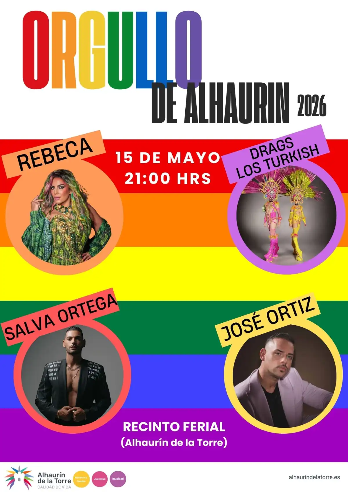 Nuevamente el evento fusiona las celebraciones en torno al Día contra la LGTBIfobia, que se celebra en todo el mundo el 17 de mayo, y del Día Internacional del Orgullo: el 28 de junio. El Orgullo Alhaurín 2026 contará con un completo cartel artístico que promete animar al público asistente. Sobre el escenario actuarán los artistas Rebeca, Salva Ortega y José Ortiz, que ofrecerán actuaciones musicales dirigidas a todos los públicos. Además, la velada incluirá el espectáculo drag de Los Turkish, que aportarán diversión, talento y un ambiente festivo característico de este tipo de celebraciones.
