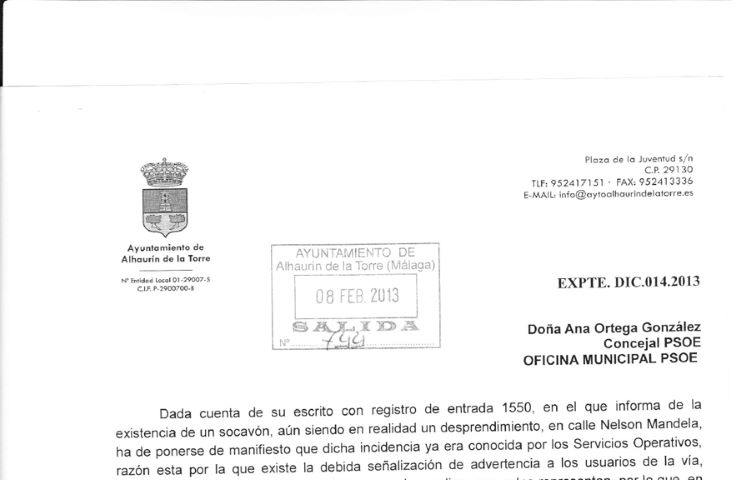 Tal y como se adjuntan en los dos escritos, el de solicitud y el de respuesta, se lee claramente que es el Sr. Alcalde, el que explica que la existencia del socavón ya es conocido por el departamento del servicio operativos.