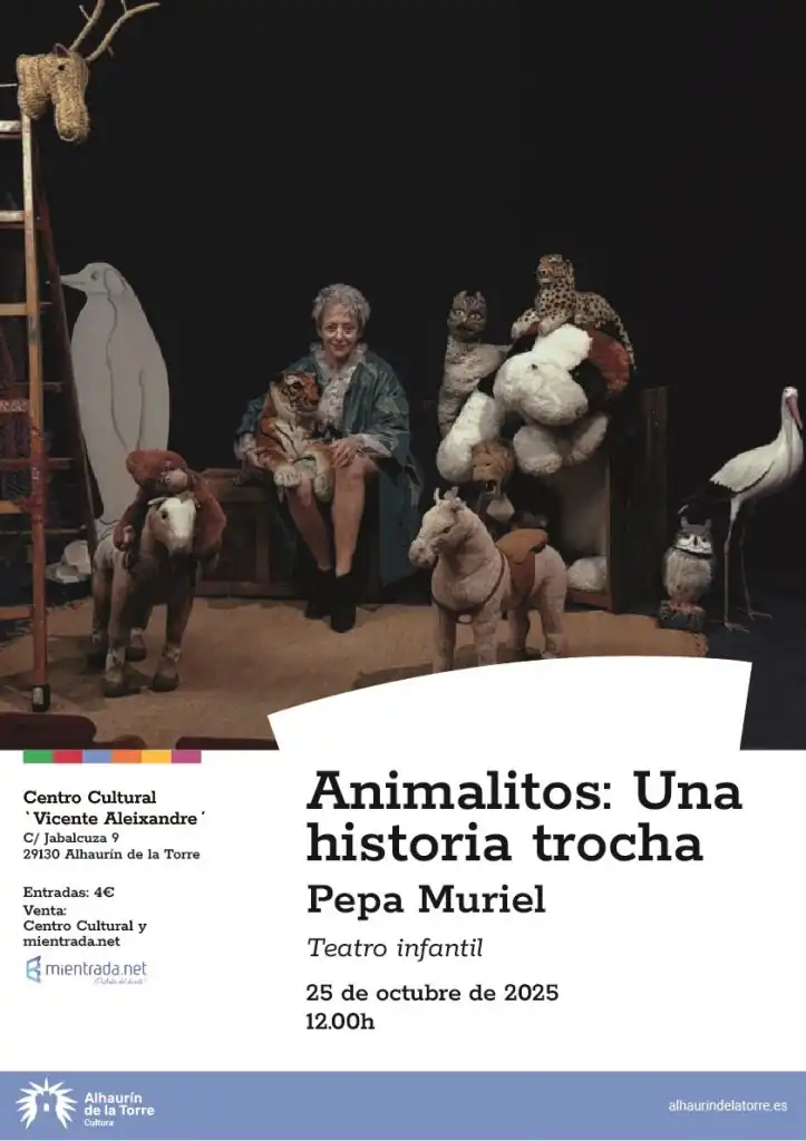 El Área de Cultura que dirige Manuel López ha programado una nueva función teatral destinada al público infantil desde los 4 años. Será el sábado, 25 de octubre, a las doce del mediodía en el Centro Cultural ‘Vicente Aleixandre’ con la obra ‘Animalitos: una historia trocha’ con entradas numeradas a 4 euros a la venta en www.mientrada.net y en el mismo centro Cultural: https://www.mientrada.net/evento/animalitos-una-historia-trocha/