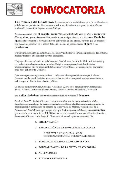 Desde el Foro Vecinal de Cártama, se hace un llamamiento a dirigentes municipales de toda la comarca así como a lideres de fuerzas políticas para así hacer mayor fuerza en las protestas.