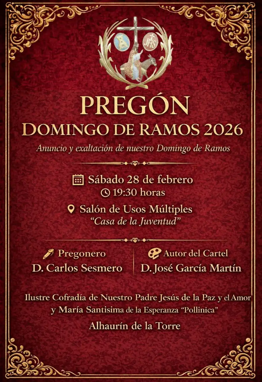 El calendario de pregones previos a la Semana Santa de Alhaurín de la Torre continúa este próximo sábado, 28 de febrero, de la mano de la Ilustre Cofradía de Nuestro Padre Jesús de la Paz y el Amor y María Santísima de la Esperanza, la Pollinica. La cita es a las 19.30 horas en la Casa de la Juventud y la entrada es libre hasta completar aforo.