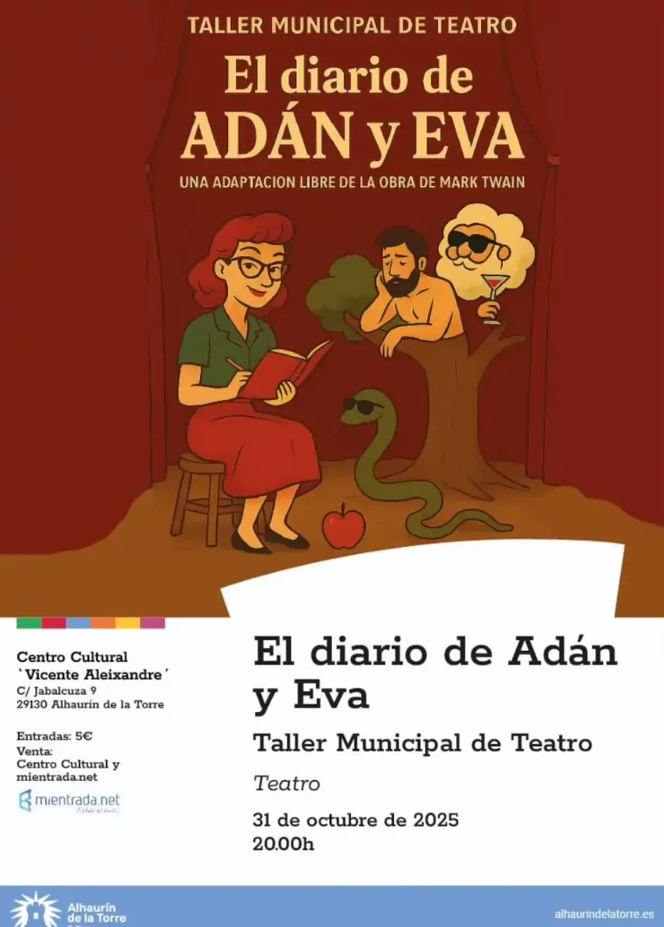 El Centro Cultural ‘Vicente Aleixandre’ de Alhaurín de la Torre será escenario este próximo viernes, 31 de octubre, de la representación de la comedia ‘Los diarios de Adán y Eva’: una particular versión del clásico de Mark Twain a cargo del Taller Municipal de Teatro que dirige Francisco Martín Donaire.