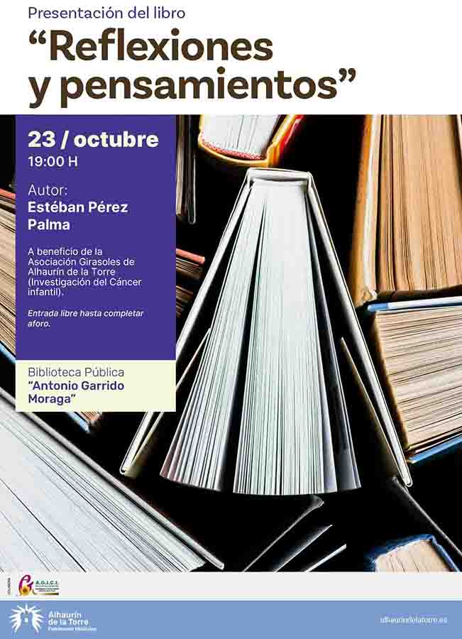 La Biblioteca Municipal ‘Antonio Garrido Moraga’ de Alhaurín de la Torre acogerá este próximo jueves, 23 de octubre, la presentación del libro ‘Reflexiones y pensamientos’, escrito por el artista afincado en el municipio Esteban Pérez Palma. El acto comenzará a las siete de la tarde y la entrada es libre hasta completar aforo.