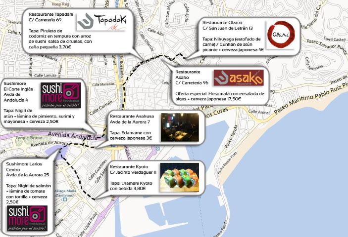 Con motivo de la I Semana Cultural de Japón, entre los días 9 y 18 de noviembre los malagueños tendrán la oportunidad de degustar algunos platos típicos nipones en formato tapa, combinando lo mejor de nuestra tradición con la gastronomía japonesa. En esta primera edición de la ruta de la tapa participan 7 restaurantes de comida japonesa,