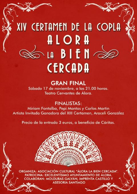 La Final del XIV Certamen de la Copla «Álora, La Biencercada» tendrá lugar el próximo Sábado 17 de Noviembre, a partir de las 21:00 en el Teatro Cervantes de Álora.