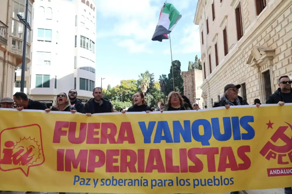 (Izquierda Unida) En declaraciones realizadas durante la manifestación celebrada esta mañana en Málaga, el coordinador general de IU Andalucía, Toni Valero, y el secretario político del PCE en Málaga, José Miguel López, han acusado a la OTAN de actuar al servicio de los intereses de Estados Unidos y han reclamado abrir en España un debate sobre la salida de la Alianza Atlántica, denunciando el incremento del gasto militar y la subordinación a la estrategia de Donald Trump.