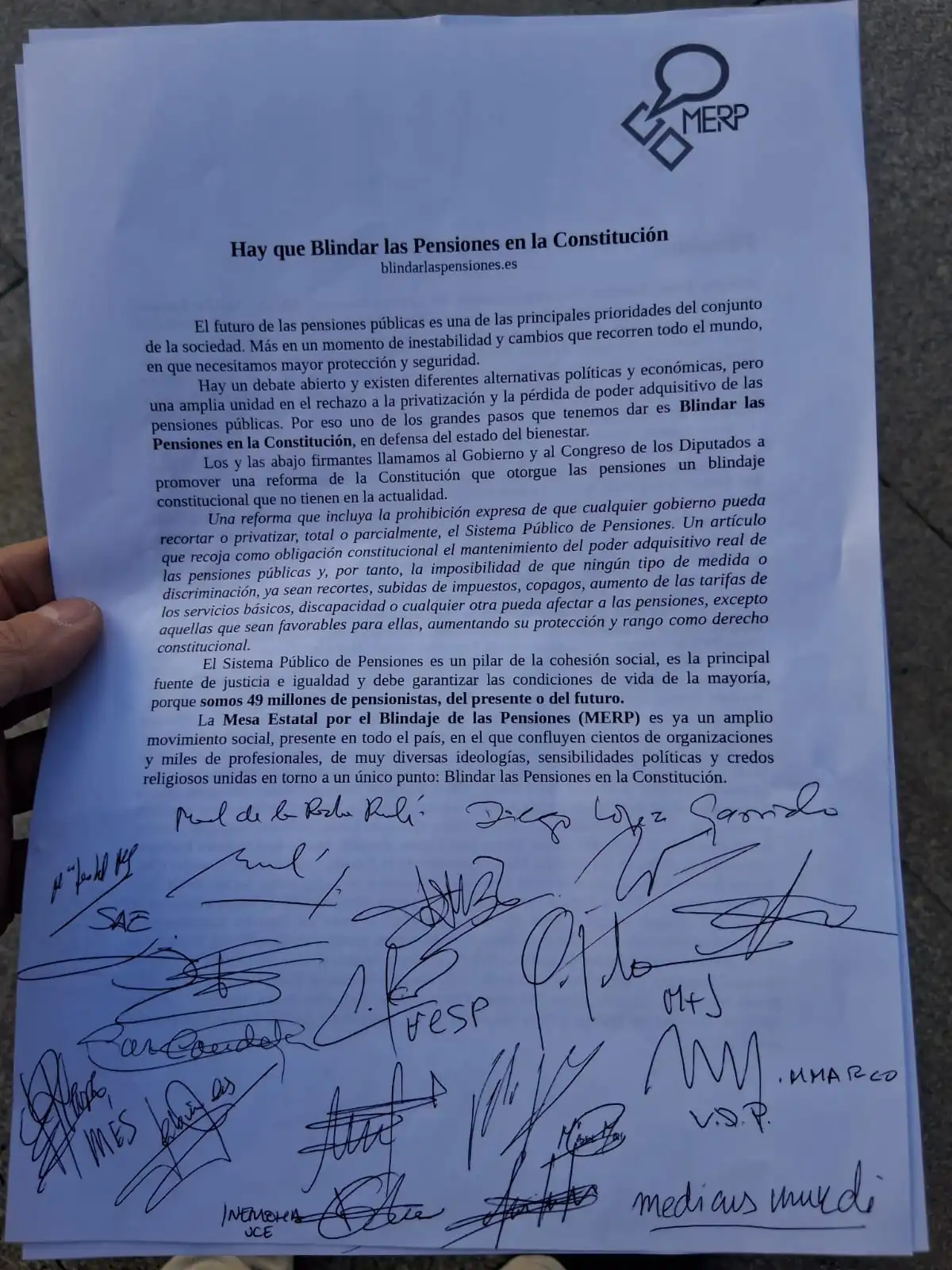 La Mesa Estatal por el Blindaje de las Pensiones (MERP) somos ya un amplio movimiento social, presente en todo el país, donde confluyen más de quinientas organizaciones de toda índole, asociaciones de todo tipo, plataformas muy diversas y miles de profesionales y personalidades firmantes de muy distintas ideologías, sensibilidades políticas y credos religiosos, unidos por un único objetivo, blindar las Pensiones en la Constitución.