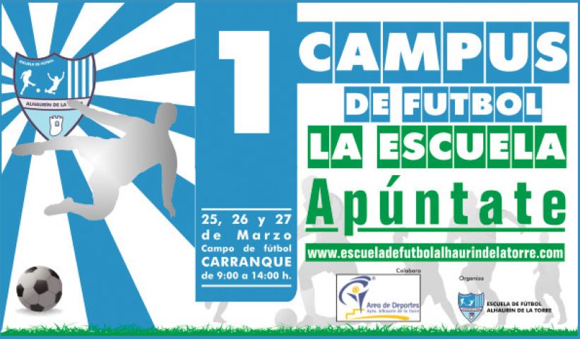 Los días 25, 26 y 27 de Marzo la Escuela de fútbol Alhaurín de la Torre organiza en las instalaciones de Carranque su 1º Campus de Fútbol destinado a niños y niñas de 5 a 12 años, orientado a mejorar su técnica deportiva y disfrutar de las vacaciones de Semana Santa mediante actividades formativas y lúdicas relacionadas con el fútbol. Las sesiones estarán dirigidas por Juan Ferrando, Director de Metodología de la escuela, preparador físico del Juvenil B de la Málaga CF y ex-preparador físico de Cesc Fábregas y Van Persie. Dentro del programa de actividades habrá un entrenamiento específico de porteros, bajo la supervisión de un entrenador cualificado con titulación nacional. A media mañana, un desayuno basado en la enseñanza de la nutrición deportiva, marcará el momento de descanso e hidratación de los participantes, los cuales dispondrán del material de entrenamiento en todas las sesiones. También recibirán la visita de un profesional del fútbol actual.