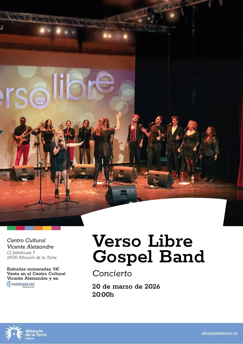 La música gospel tendrá su hueco en la programación de primavera del Área de Cultura que dirige Manuel López con una interesante cita en el Centro Cultural ‘Vicente Aleixandre’ el viernes, 20 de marzo, a partir de las ocho de la tarde a cargo del proyecto musical Verso Libre Gospel Band.