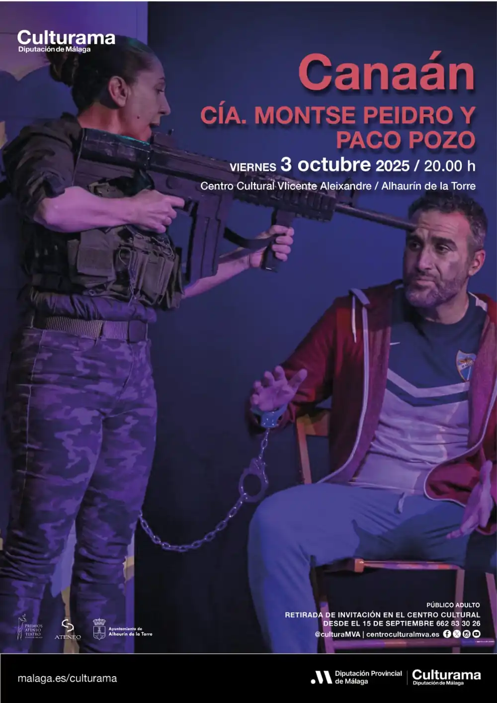 El Área de Cultura que dirige Manuel López, en colaboración con la Diputación Provincial de Málaga a través de su programa Culturama, ha programado para el próximo viernes, 3 de octubre, a las ocho de la tarde la representación de la obra de teatro ‘Canaán’ a cargo de la compañía de Montse Peidro y Paco Pozo. La cita, en el Centro Cultural ‘Vicente Aleixandre’, es completamente gratuita previa recogida de invitaciones desde ya en el Centro Cultural en su horario de apertura, es decir, de lunes a viernes de 10 a 13:30 horas.