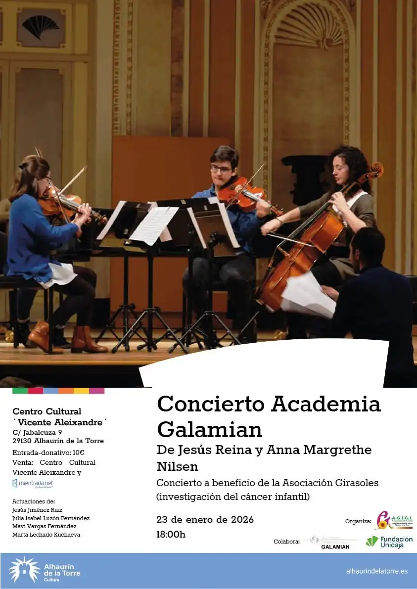 El Centro Cultural ‘Vicente Aleixandre’ acogerá el próximo 23 de enero a partir de las seis de la tarde un concierto de la academia Galamian. El evento está organizado por la asociación Girasoles, con la colaboración del Área de Cultura. Se trata de un acto a beneficio de esta asociación para la investigación del cáncer infantil.