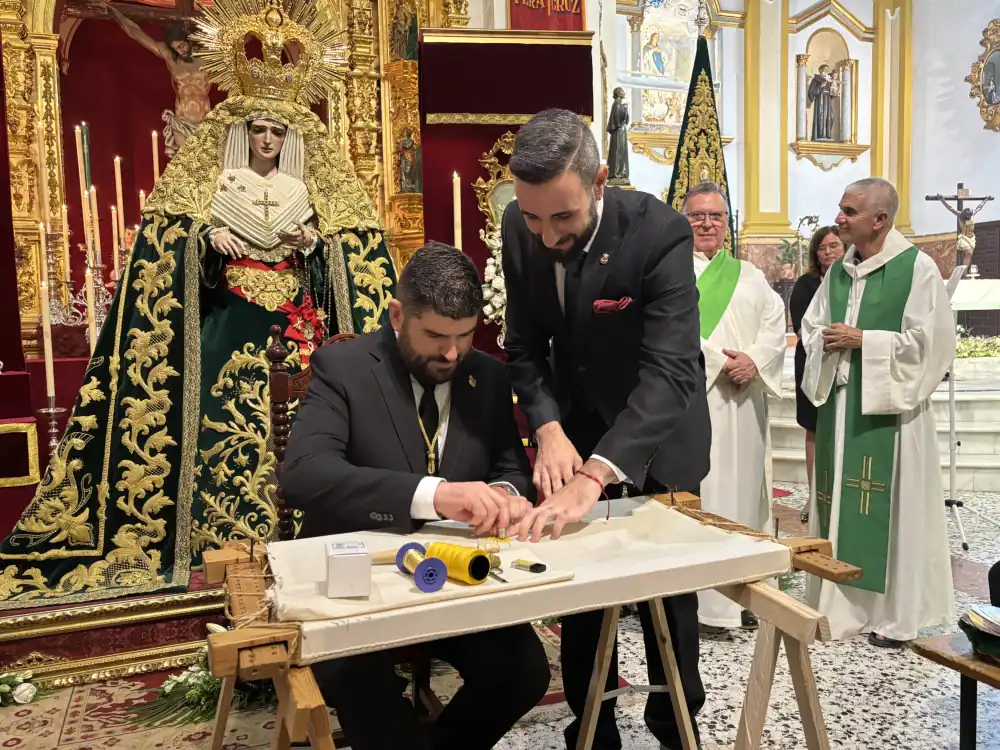 El hermano mayor impuso a medalla corporativa a Leo Moreno como nueva camarera mayor de la Cofradía, y se firmó el contrato que permitirá que el bordador Samuel Cervantes, también vestidor de Nuestra Señora de la Soledad, inicie el trabajo de bordado del interior de las bambalinas laterales del trono de la virgen, a la vez que tanto él como José María García dieron la primera puntada al mismo.