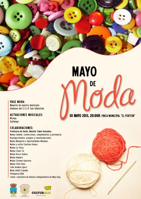Nos complacemos en invitarles a una inciativa organizada por el Área del Mayor y la Concejalía de Cultura y Educación, en colaboración comercios alhaurinos y la Asociación de Madres y Padres (AMPA) del CEIP «San Sebastián»: «Mayo de Moda». Esta actividad incluirá pase de modelos, actuaciones musicales y muchas soprepresas. La cita es el jueves 30, a las 19’30 horas en el auditorio de la Finca El Portón.