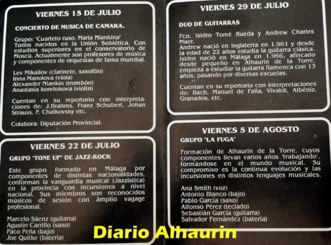 En el año 94, con todo un mundo de cambios por realizar en El Portón, ya se podía disfrutar del mas variopinto de los carteles, Grupos como «La Fuga», donde ya hacían sus pinitos los grandes participes del futuro musical de Alhaurín de la Torre, como Pablo y Sebastián García Vega, Música Clásica de Cámara, con todo un Cuartero Ruso, por supuesto Jazz, con el grupo Tune Up de Málaga, y nuestra pareja de Guitarras quienes amenizaban con temas desde Bach, Falla, Albéniz, Granados o el mismísimo Vivaldi.