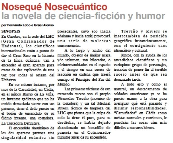 Como ya saben, se trata de la primera obra de ciencia-ficción que transcurre en Cádiz y en El Mundo. Durante el acto, sus autores, Israel Alonso y Fernando Lobo hablarán del proceso de creación de esta obra, de la colaboración inestimable de José Guerrero Roldán, «El Yuyu», como prologuista y de Mel (El Jueves) en las ilustraciones. Así mismo se hablará de la concepción de la trama del libro, de las andanzas y peripecias de Wenceslao Treviño (inventor gaditano) y Michael Rivers (técnico de limpieza en el Gran Colisionador de Hadrones, en Suiza) cuando sus destinos se entrecruzan merced a una singularidad cuántica que amenaza con traer el fin del mundo.