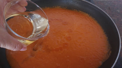 | Poner el aceite en una sartén y cuando esté caliente le incorporamos las cabezas y caparazones de los langostinos y freímos. Cuando tengan un color dorado, las retiramos. |