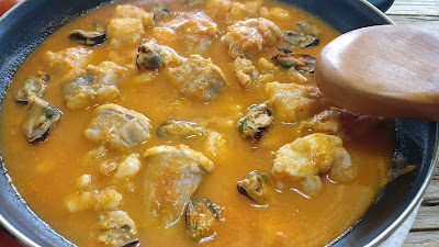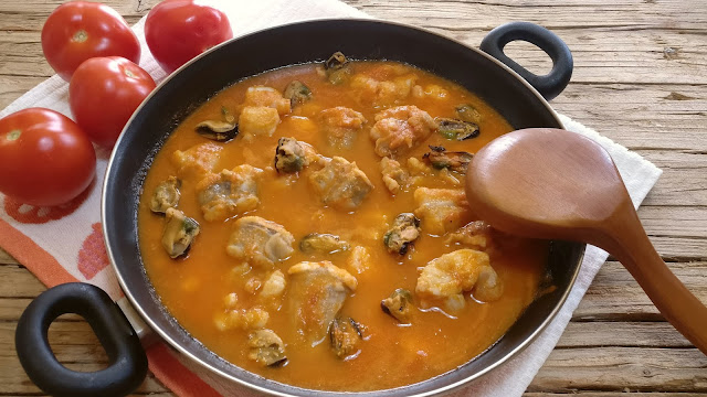 | Añadimos los trozos de rape y cocemos a fuego lento 6 o 7 minutos, después añadimos los langostinos cocemos 3 minutos más, retiramos la sartén del fuego y añadimos los mejillones pelados |