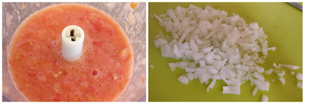 Pelar los tomates y triturarlos junto con los pimientos. Pelar y cortar en trozos pequeños la cebolla. |