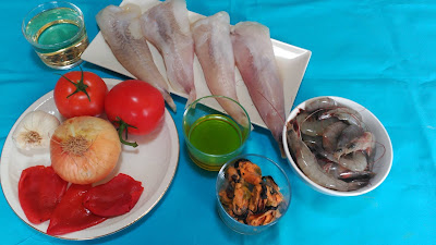 | Añadimos los trozos de rape y cocemos a fuego lento 6 o 7 minutos, después añadimos los langostinos cocemos 3 minutos más, retiramos la sartén del fuego y añadimos los mejillones pelados |
