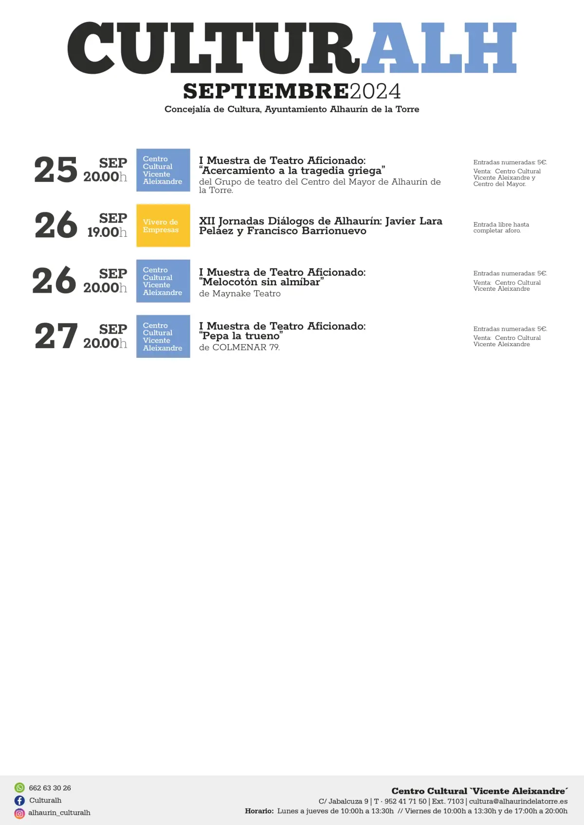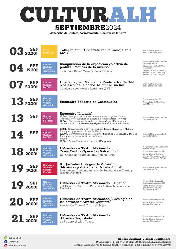 Septiembre 2024 trae una variada programación cultural a Alhaurín de la Torre, organizada por la Concejalía de Cultura del Ayuntamiento. Los eventos se centran en exposiciones, charlas literarias, encuentros solidarios y representaciones teatrales, entre otros.