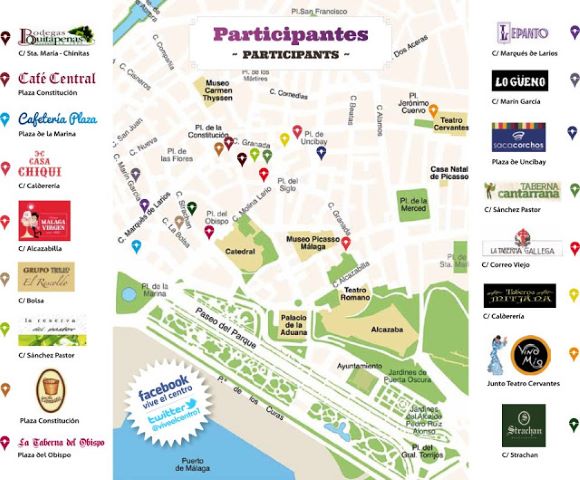 Los establecimientos que forman parte del grupo V’ive el Centro’, que son: Café Central, Cafetería Plaza, Taberna Gallega, Casa Chiqui, El Pimpi, La Canasta, El Mentidero, Taberna del Obispo, Taberna Mitjana, Bodegas Quitapenas, Lo Güeno, Lepanto, Strachan, Sacacorchos, Grupo La Reserva, Grupo El Trillo y Vino Mío.
