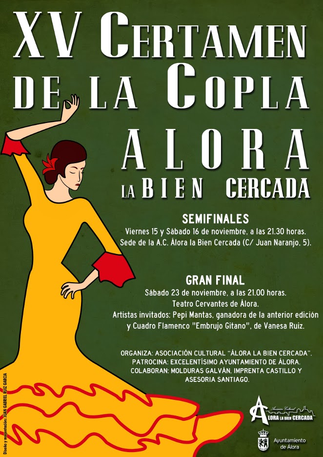 Habiéndose reunido el jurado y oido las interpretaciones de los/las artistas presentados/as para el XV Certamen de la Copla «Álora, La Bien Cercada», han sido seleccionados/as los/las siguientes artistas y convocados/as a las Semifinales a celebrar los días 15 y 16 de Noviembre, en la Sede de la Asociación, C/ Juan Naranjos 5. En ambas convocatorias, se interpretarán tres temas por cada semifinalista en dos rondas; una primera con dos temas, donde el primero no púntua (sólo púntua el segundo); y una segunda ronda, con un tema, que también púntua.