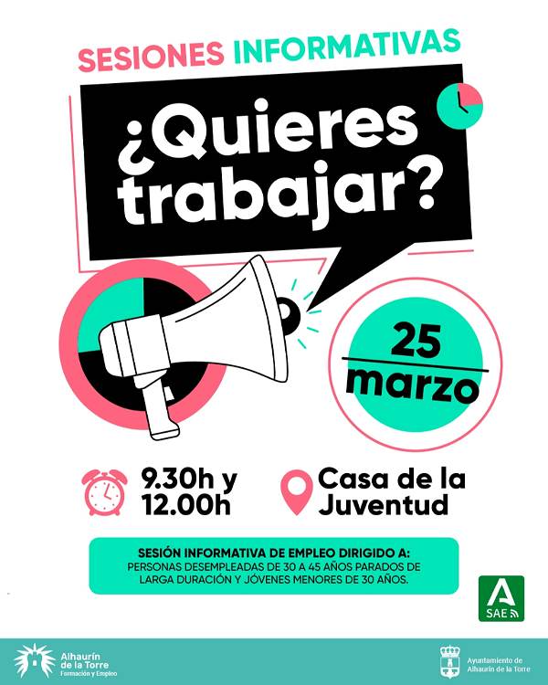 El Ayuntamiento de Alhaurín de la Torre ha organizado dos sesiones informativas dirigidas a las personas interesadas en participar en los nuevos programas de empleo y formación que se pondrán en marcha en el municipio. Estas sesiones tendrán lugar el próximo 25 de marzo, a las 9:30 y a las 12:00 horas, en la Casa de la Juventud.