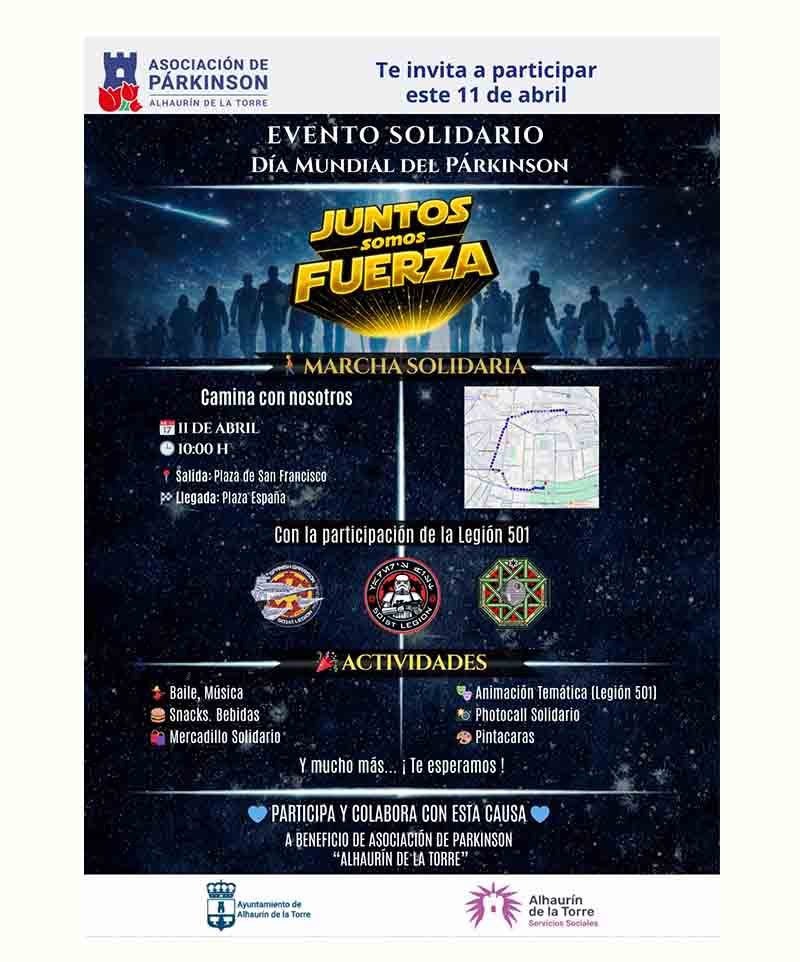 La cita, en colaboración con el Área de Asuntos Sociales e Igualdad que dirige María del Carmen Molina, dará comienzo a las diez de la mañana en la sede de la asociación, en la Plaza de San Francisco, de donde partirá una marcha con la presencia de la Legión 501, un grupo de voluntarios caracterizados como personajes de la saga Star Wars con quienes el público podrá fotografiarse y disfrutar. El recorrido será por calle Málaga, Plaza de San Sebastián, Avenida de España y Avenida Cristóbal Colón hasta la Plaza de España donde tendrá lugar el grueso de las actividades programadas.