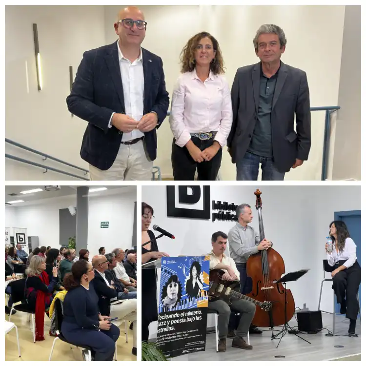 La Sala María Moliner de la Biblioteca Pública Municipal Antonio Garrido Moraga volvió a llenarse este miércoles para disfrutar de una nueva sesión del ciclo ‘Tecleando el misterio: Jazz y Poesía bajo las estrellas’. La actividad, organizada por el Centro Cultural Generación del 27 de la Diputación Provincial de Málaga en colaboración con el Área de Cultura, contó con la poeta malagueña María José Carrasco y la música en directo de Ana Cisneros Trío. El concejal de Cultura, Manuel López, también estuvo presente en la velada.