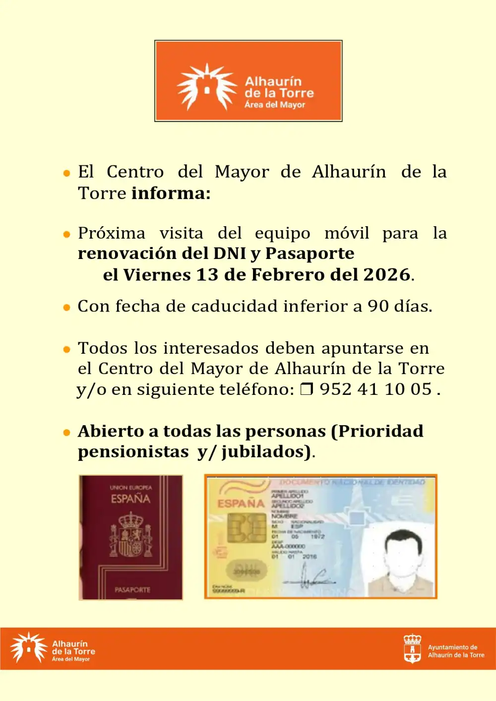El Centro del Mayor ‘San Sebastián’ de Alhaurín de la Torre ha comunicado que el próximo viernes 13 de febrero se desplazará nuevamente al municipio un equipo móvil de expedición para la renovación del DNI y del pasaporte. Este servicio está dirigido a todas aquellas personas cuyos documentos tengan una fecha de caducidad inferior a 90 días. La actividad está abierta a toda la población, aunque se dará prioridad a pensionistas y personas jubiladas.